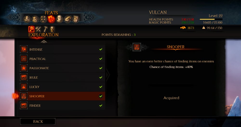 To increase your chances of finding more and better items, you should master a few exploration feats: Lucky, Snooper and Mule. The first two will increase your chances of finding superior items by 60% altogether. Additionally, the third feat will allow your hero to carry +50 in weight, which means you’ll be able to carry more items without getting any weight penalties.