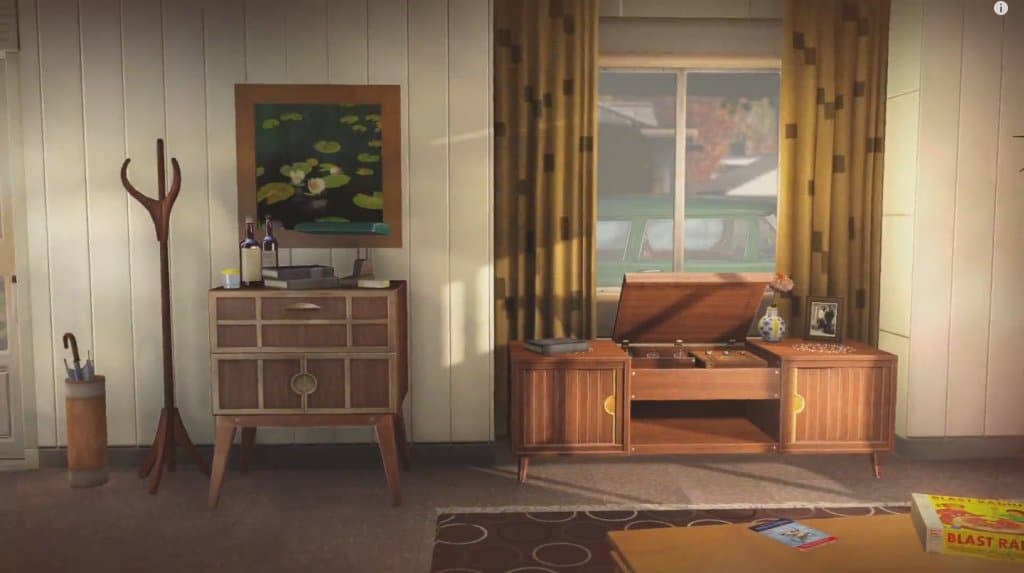 As we near the end of the trailer, we have a shot that offers us a ton of information. Except for the cool Power Armor that might show some tweaking (see the difference between the left and right arms). Also, on our left, we see a Bobblehead, so we’re going to collect a ton of those too. There are also weapons that might hint at some crafting, as well as magazines that will most likely boost our stats. Could that actually be our in-game house? Maybe!
