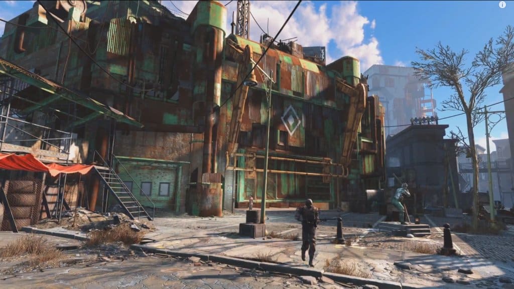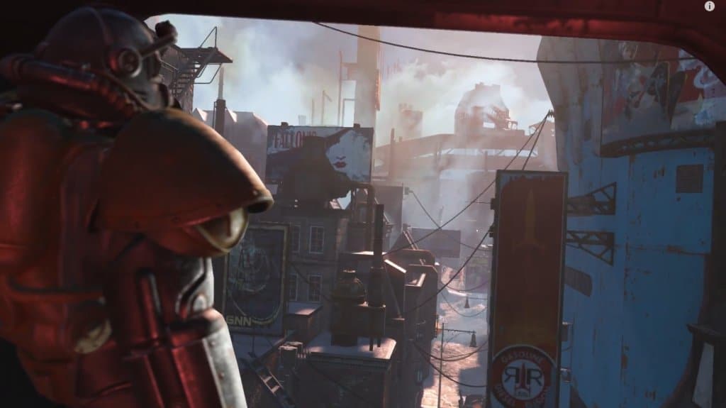 Finally, an extremely colorful version of Scollay Square, a place in Boston that was actually demolished (in real life) back in the 60s. We also see our Mysterious Stranger walking casually down the street – so he’s returning too! There’s also lightning and some rain in this shot, which might mean that we’ll have different types of weather in Fallout 4!